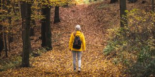 Hike in autumn forest. Tourist woman walking in woodland footpath at fall season