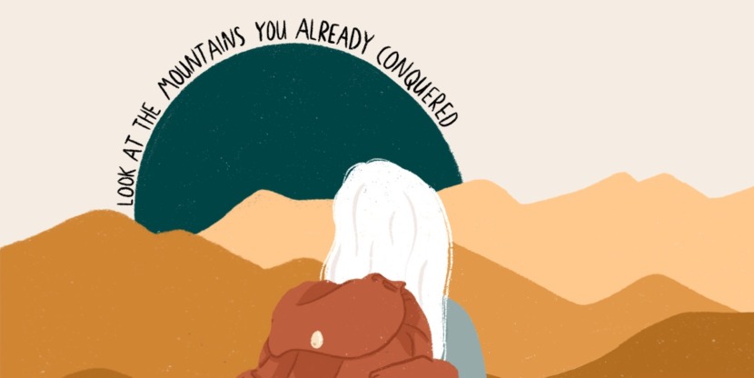 Als ik even de hoop niet meer voel, en weer aan de voet van een nieuwe berg sta, probeer ik het me te herinneren: al die andere bergen. Dan kijk ik achterom, zie ik ze in elkaar overvloeien als een landschap op een schilderij, en dan voel ik het weer: de moed. Ik kan dit. En dan zet ik de eerste stap.