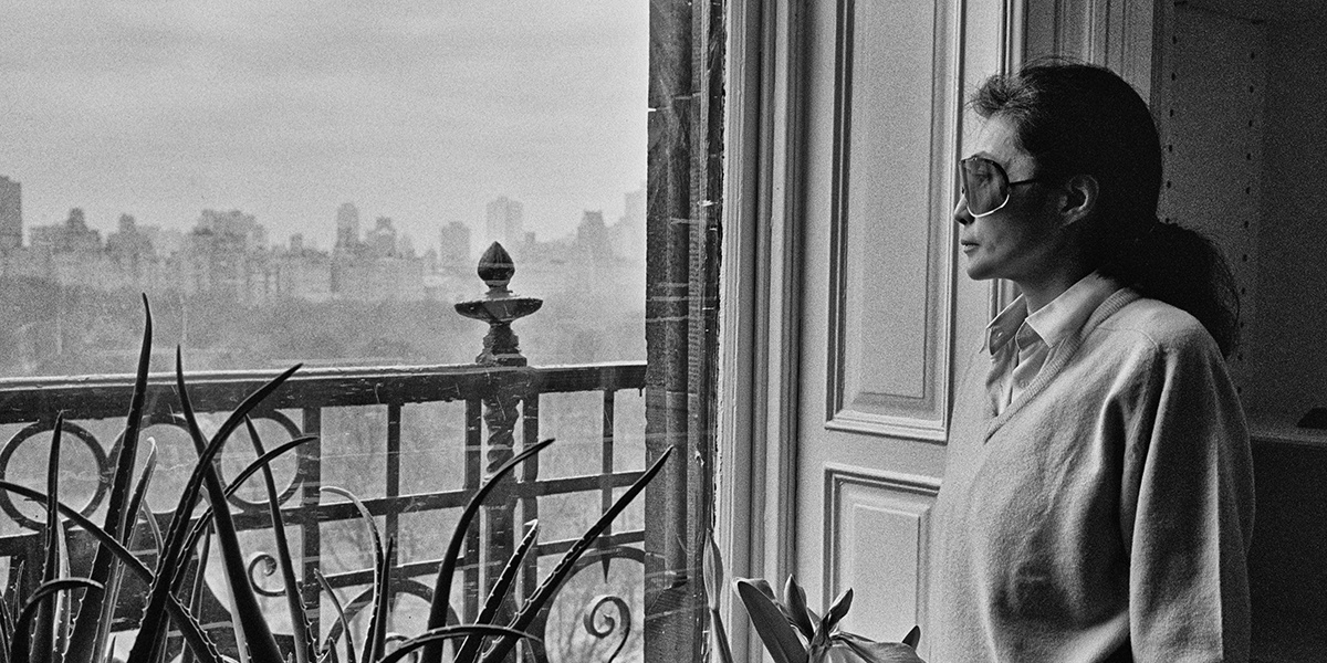 Japanese multimedia artist, singer and songwriter Yoko Ono in the lounge of the apartment she shared with John Lennon, one year to the day after he was murdered outside the Dakota building where they lived on Central Park West, Manhattan, December 8th 1981. She is wearing a pair of Porsche wrap around sunglasses. (Photo by Derek Hudson/Getty Images)