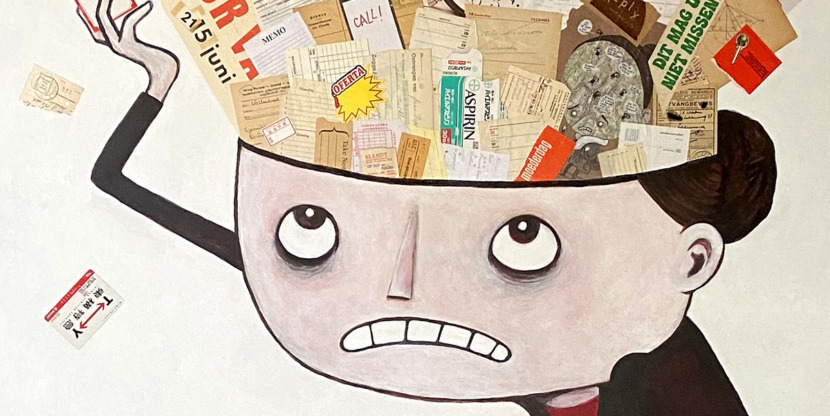 “In de Flow Slow Art Route is er een muurschildering van mij aan mijn tekentafel te zien. In de schildering heb ik een enorm hoofd dat gevuld is met collage-papiertjes, zoals bonnen en to do-lijstjes. Hiermee wil ik het gevoel van een propvol hoofd vol verplichtingen en angsten weergeven. Het is geïnspireerd op hoe ik mij voelde toen ik een burn-out had.”