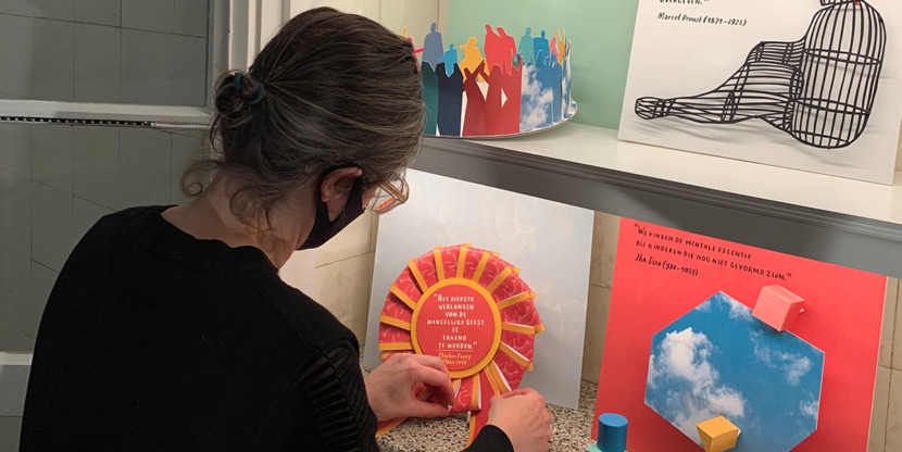 “Ik vulde de zogenaamde ‘denkerskast’ met zestien verschillende papieren 2D- en 3D-illustraties. Elke illustratie in de kast verbeeldt een uitspraak van een bekende denker over wat ‘de geest’ is. Dat zijn uitspraken van onder anderen Sigmund Freud, Boeddha en Kendrick Lamar. Soms is het een kijkdoos-achtig beeld geworden met papieren illustraties – een beetje zoals je die kent van het Flow Book for Paper Lovers.”