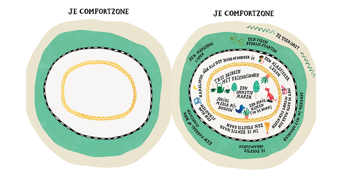 Doe je weleens iets buiten je comfortzone of blijf je er liever binnen? Door je eigen comforzone-cirkel te tekenen kom je erachter welke dingen je goed afgaan en energie geven, welke dingen je zenuwachtig maken of wat je nog even niet durft.