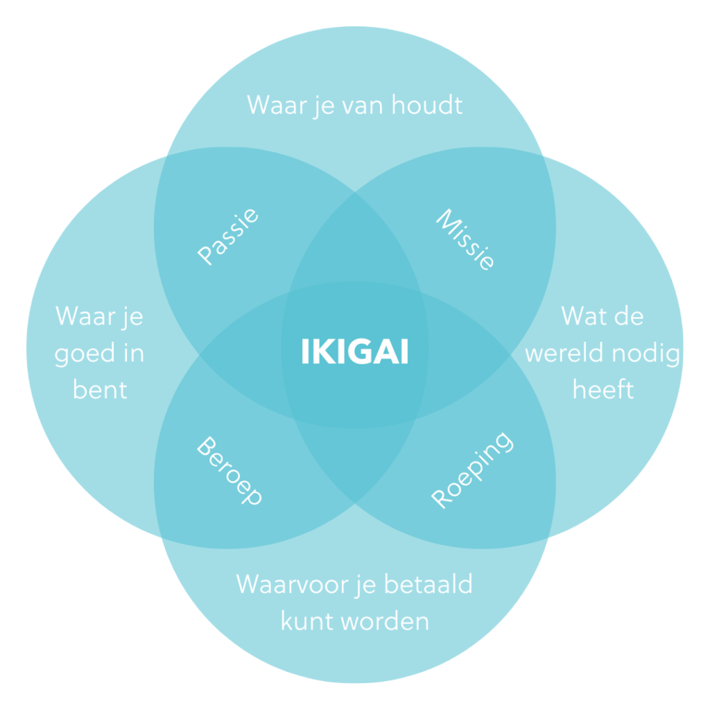Je Ikigai kun je vinden met behulp van een het Ikigai-model, een veelgebruikte coachmethodiek bij loopbaancoaching.