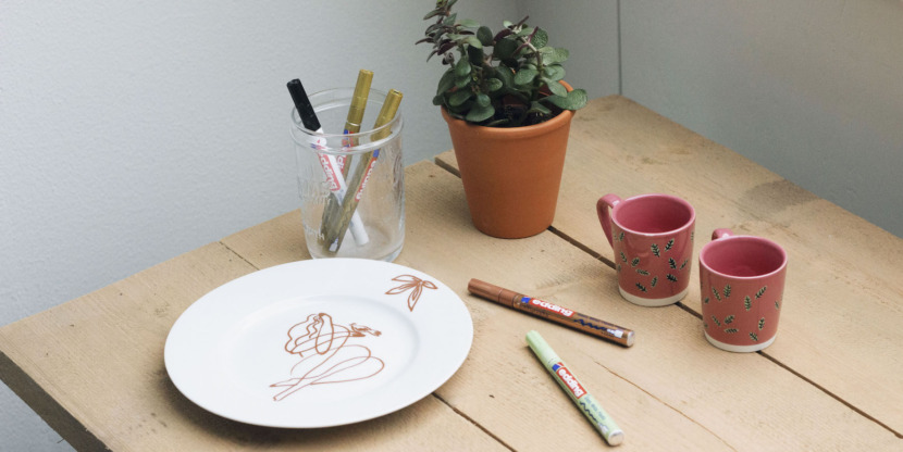 Een bord, mok, schaaltje of iets anders meer eigen maken door het zelf te versieren met de glanslakmarkers van edding. Beeldcoördinator Marjolijn Polman probeerde het uit.