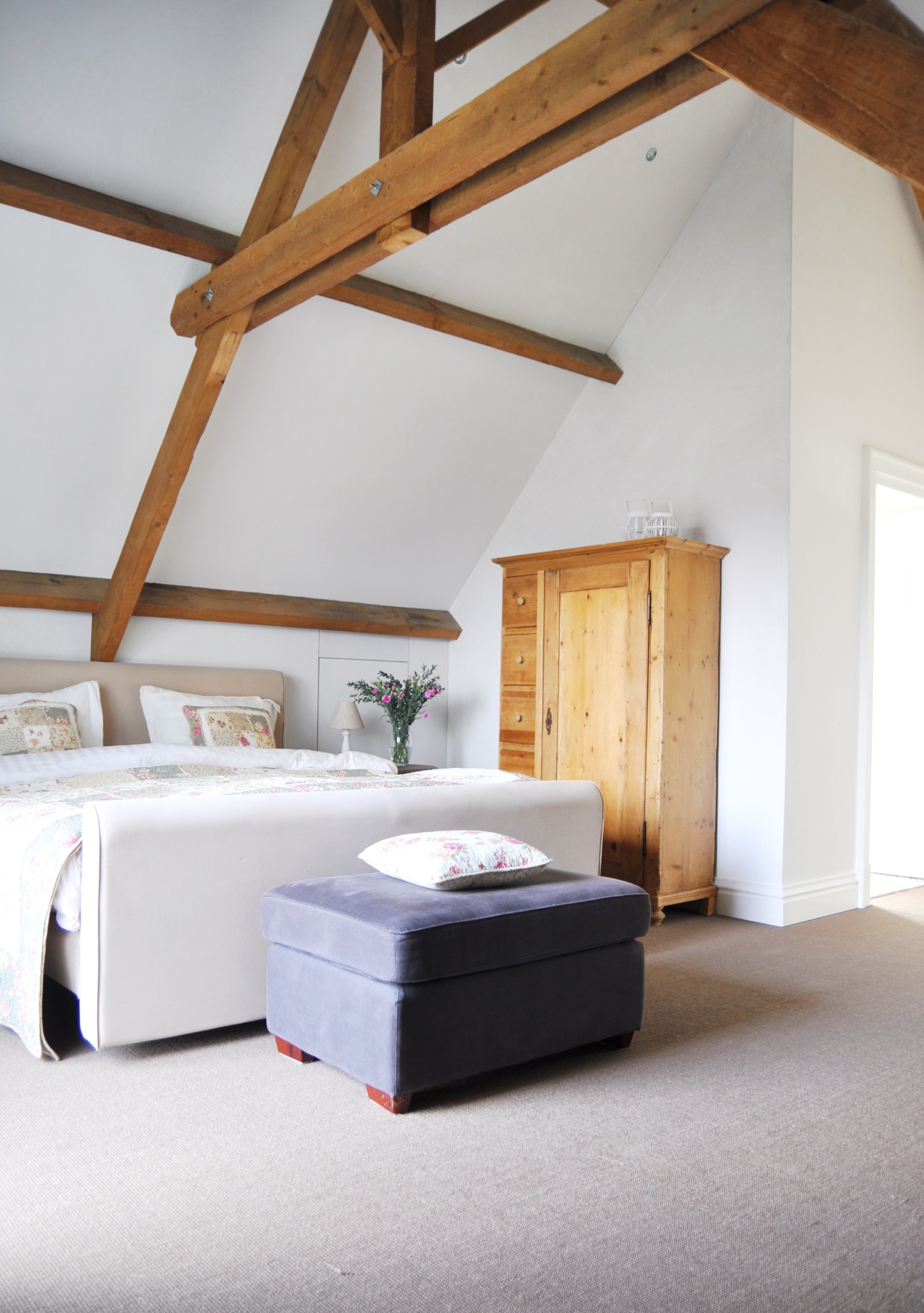Als je van landelijk houdt, is het hier heerlijk. Er is maar een kamer, maar die is zo fijn. Een beetje Engels, met veel bloemetjes. Op het servies, op de kussens en op het dekbed. Ook heb je een eigen badkamer met toilet en een balkon dat uitkijkt over de akkers van Budel. Je kunt na een lange dag wandelen een lekker warm bad (op pootjes!) nemen of de oude regen-douche. De boerderij heeft een eigen oprijlaan van honderd meter. Je bent echt even helemaal weg.