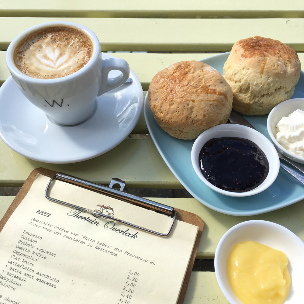 Hoewel de geur van verse appeltaart ons even deed twijfelen, bestelden we de zelfgemaakte scones die warm uit de oven kwamen. Lekker met clotted cream, jam en naar keuze citroen- of sinaasappelcurd.