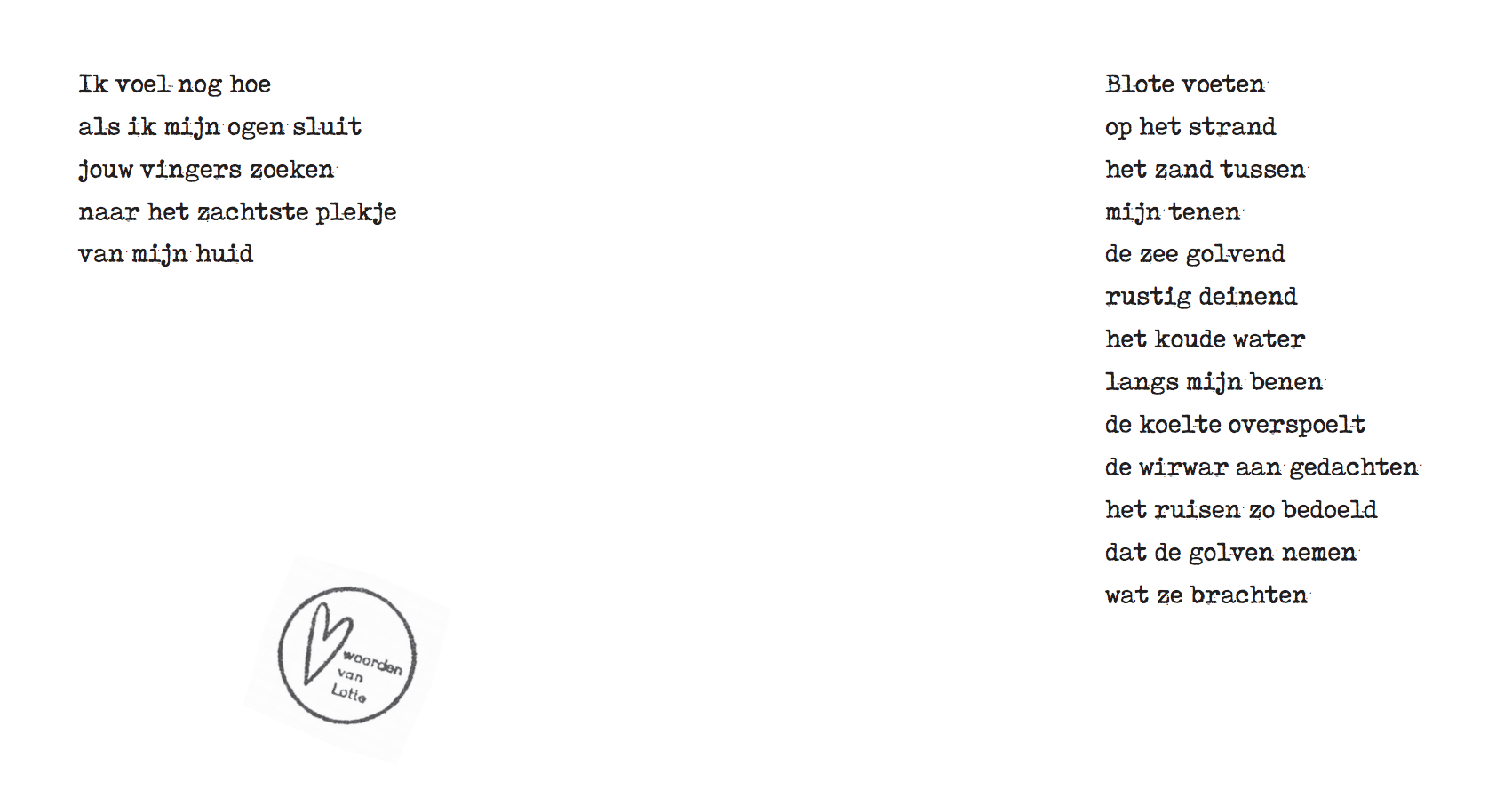 Door de alledaagse thema’s waarover ze schrijft, is haar poëzie toegankelijk voor iedereen. Het leven, de liefde, verdriet, de dood, balans en zorgen, het komt allemaal voorbij. Zo is een van onze favorieten een gedicht over de zee, en hoe het onze wirwar aan gedachten kan meenemen. Lotte: “Ik geloof in de kracht van openheid en kwetsbaarheid om zo (h)erkenning bij elkaar te kunnen vinden. Ik hoop dat mijn woorden een verschil kunnen maken.” Woorden van Lotte (Uitgeverij Orlando).