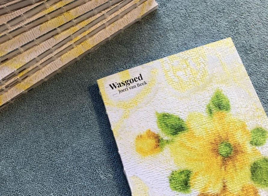 Joeri tekende al die verhalen op en samen met foto’s van de fris gewassen lakens en handdoeken maakte ze er een boekje van. De verhalen liggen symbolisch tussen foto’s van het wasgoed, dat her en der wat rafelrandjes heeft. En het witte garen van het ingebonden boekje past precies bij deze rafels van het versleten wasgoed.