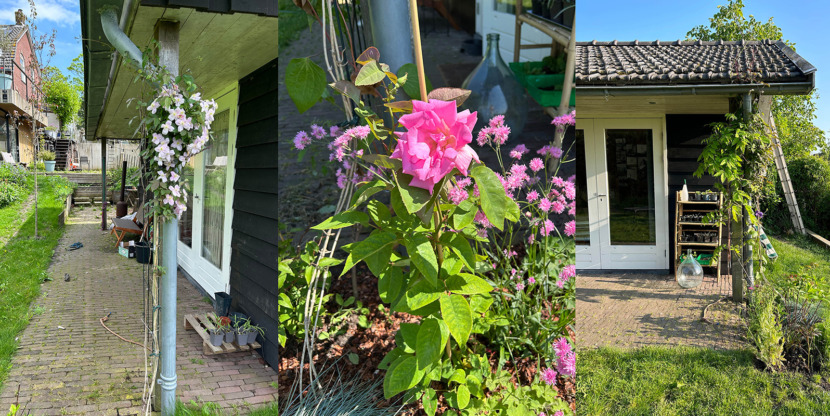 Om de klimplanten steun te geven, plaats ik overal klimrekjes die ik bij een tuincentrum heb gekocht. Er komt een Clematis, een Blauweregen en een klimroos tegen het kantoor achterin de tuin. Vanuit een schaduwrijke hoek aan de achterkant laat ik een kamperfoelie klimmen want die groeien eigenlijk overal wel.