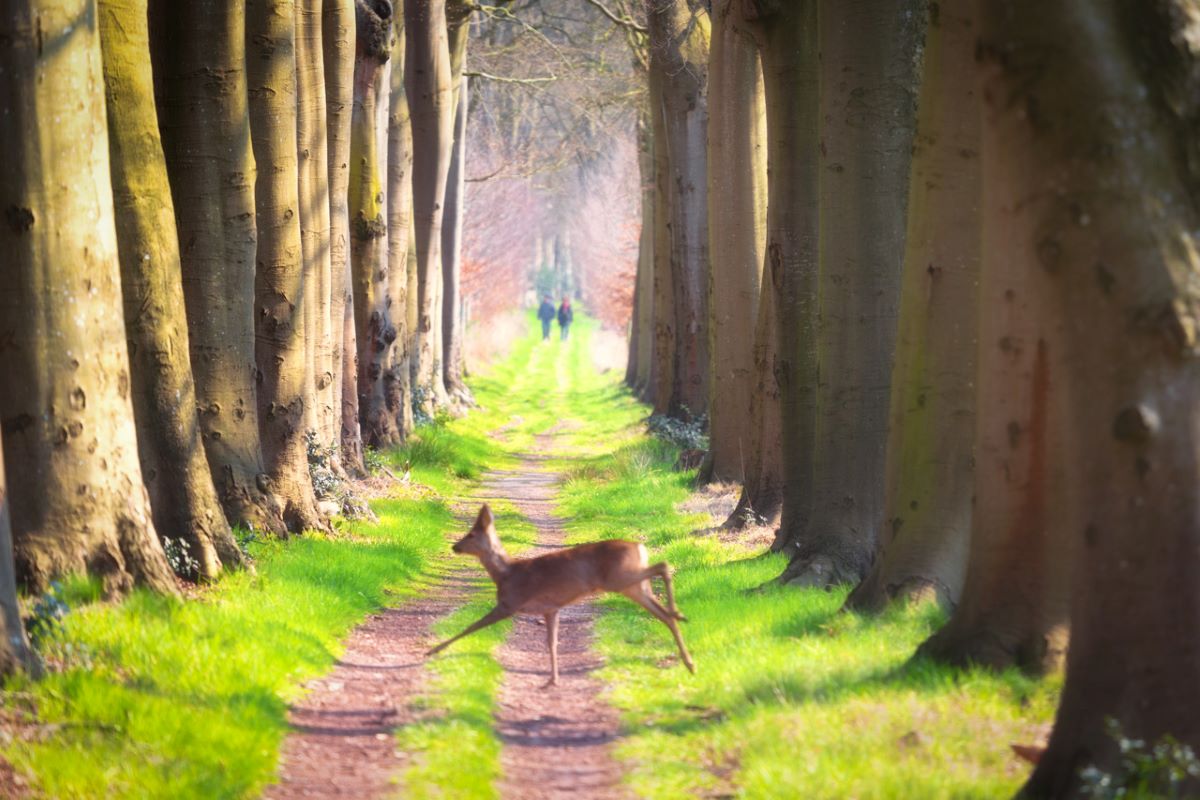 Een ree steekt over op een boslaan bij landgoed Oranjewoud. Fotografie Bas Meelker