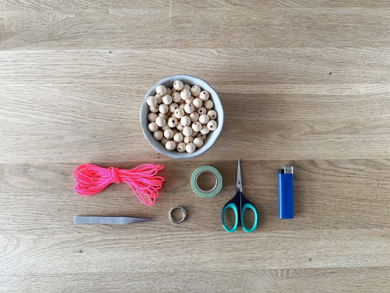 3,5-4 meter paracord type I (Ø 2 millimeter) • karabijnring (of musketonhaak) • masking tape • schaar • aansteker • 80-100 houten kralen (Ø 14 millimeter, met een gat van 3 millimeter) • pincet of tangetje met spitse punten.