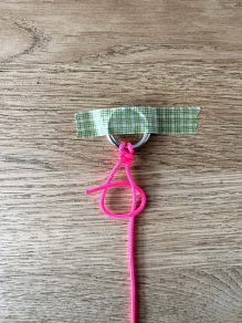 - Leg één uiteinde van de draad dubbel, het kortste eind ongeveer 14 centimeter lang. Haal de lus door de ring en vervolgens over de ring heen. Trek stevig aan.