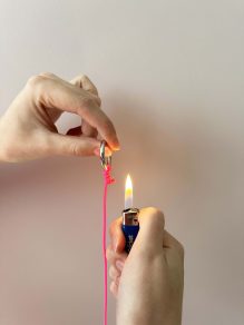 3. Knip het korte uiteinde af tot een paar millimeter van de laatste knoop. Houd de vlam van een aansteker vlak bij dit uiteinde zodat het smelt. Duw het smeltende uiteinde vervolgens snel plat met het metalen deel van de aansteker (of bijvoorbeeld een schaar). Hiermee verzegel je het: het kan niet meer rafelen en hecht zich aan de knoop.