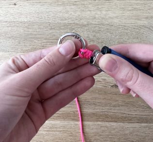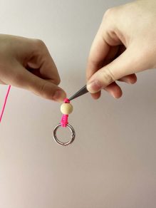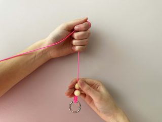 8. Herhaal tot de lengte van het koord naar je zin is. Hangt je telefoon op de goede hoogte? Knoop dan het uiteinde vast aan de ring van het begin (op de foto zie je hoe de draden daarbij moeten lopen). Trek de knoop zo aan dat je tussen de ring en de laatste kraal net genoeg ruimte overhoudt om daar weer vier halve macraméknopen te maken. Werk het uiteinde van het koord af op dezelfde manier als je aan het begin hebt gedaan met de vlam. Belangrijk: check nog een keer goed of de knopen stevig vastzitten en niet los kunnen schieten.
