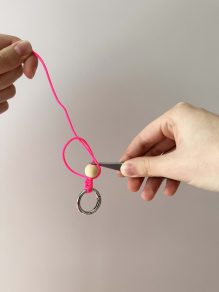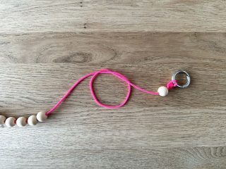 Het kralenkoord kan eerst een grillige vorm hebben doordat je de knopen zo strak aantrekt, maar eenmaal in gebruik wordt je telefoon- of sleutelketting soepeler.