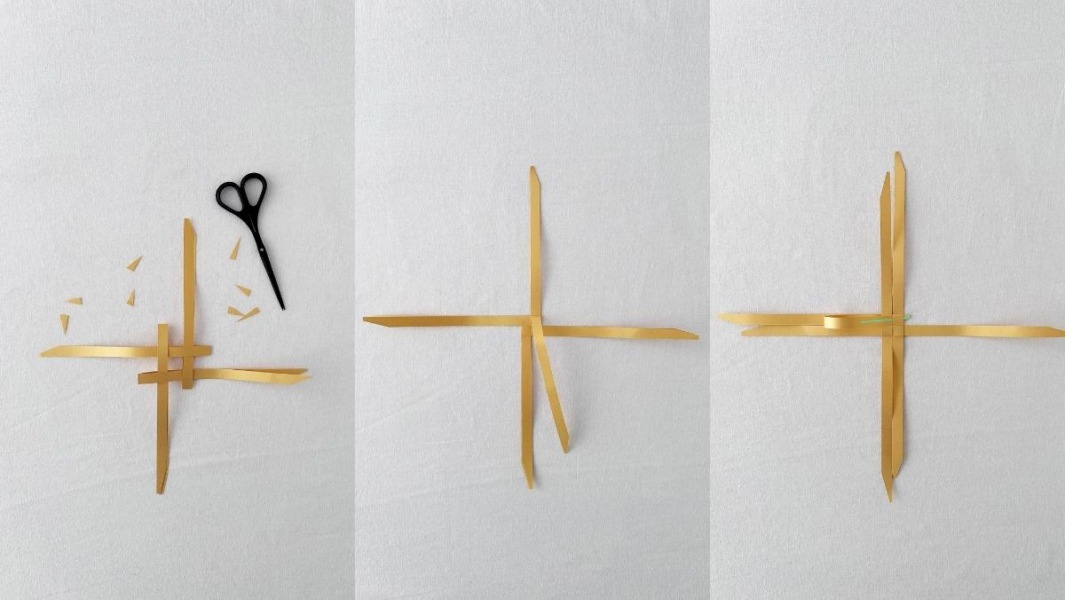 1. Vouw per ster vier stroken papier dubbel en knip een hoek van de uiteinden af. Haak de stroken in elkaar. Trek de stroken aan tot ze in het midden een vierkant vormen.