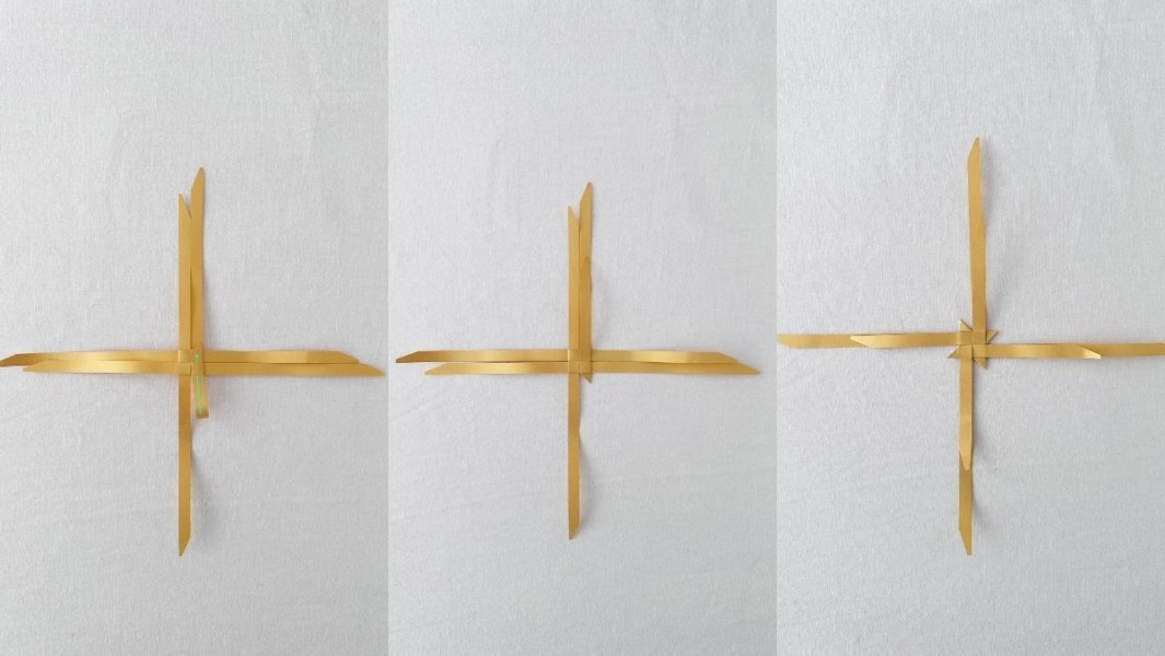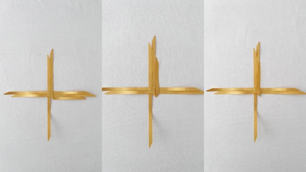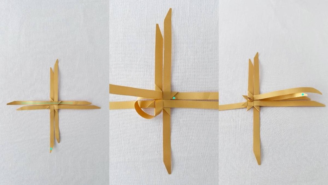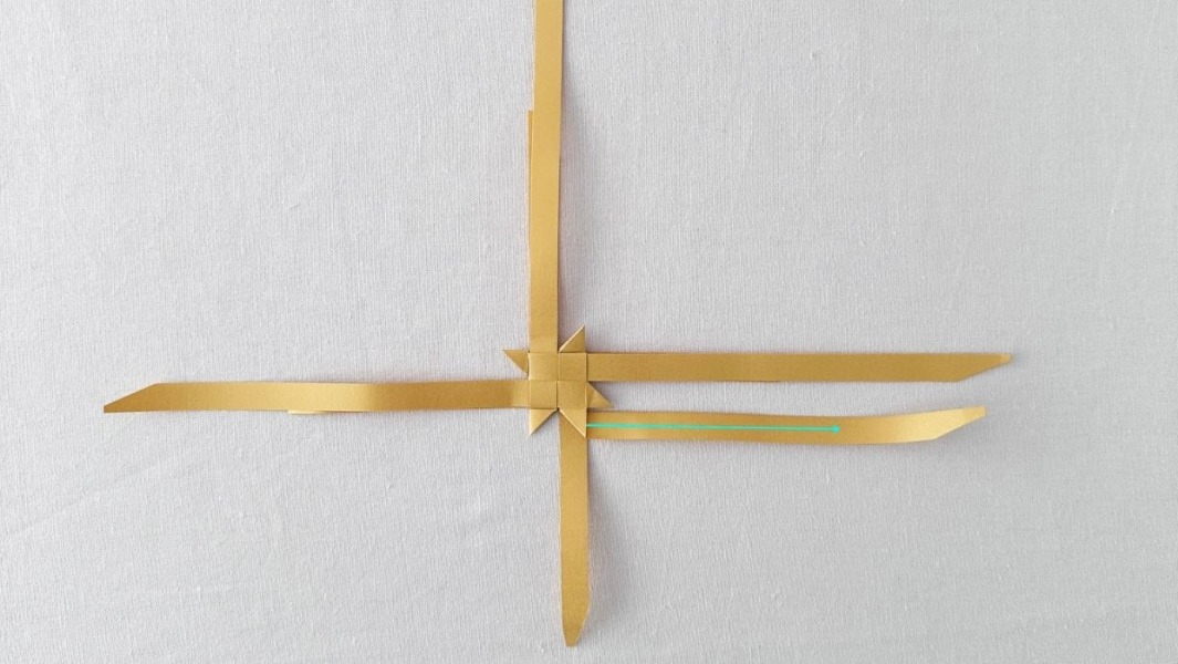 2. Pak de bovenste van de twee stroken die naar boven wijzen en vouw recht naar beneden. Daar liggen nu twee stroken naast elkaar. Ga met de klok mee en vouw ook de andere bovenste stroken in tegengestelde richting. Schuif de vierde strook onder de eerste strook door. Nu zit het vierkant vast.