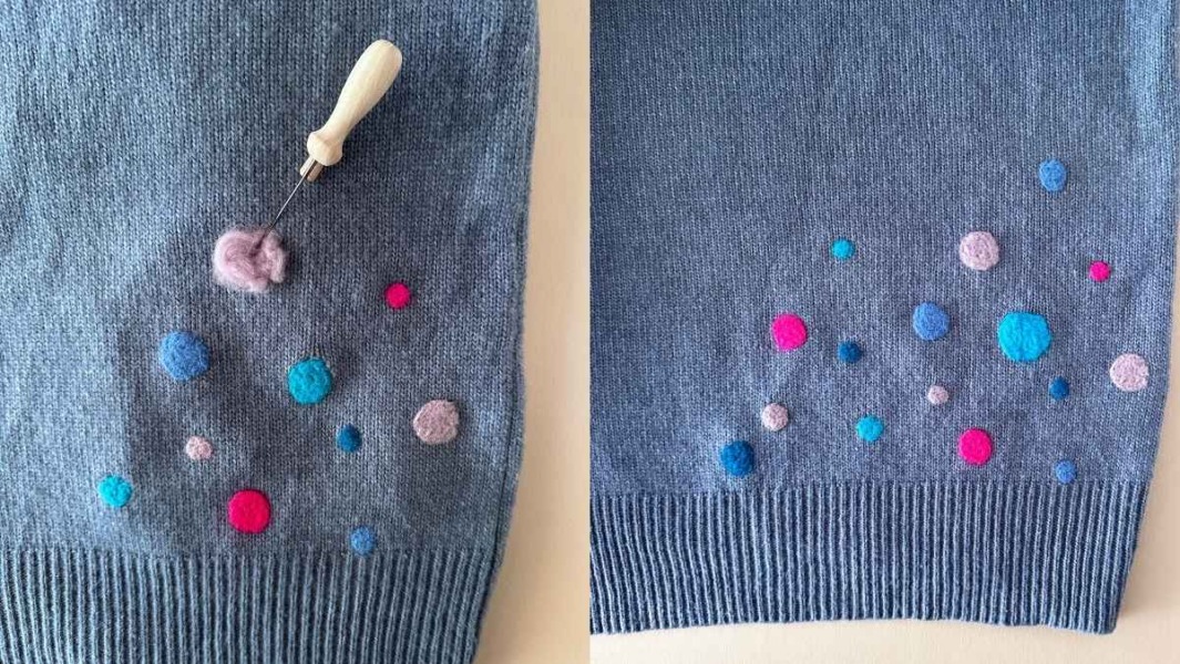 Met de naald kun je de vorm een beetje manipuleren en strak maken. Ga door tot de wol stevig vastzit en er geen losse plukjes meer zijn die loskomen als je er zacht aan trekt. Maak zo alle gaatjes in de trui dicht.