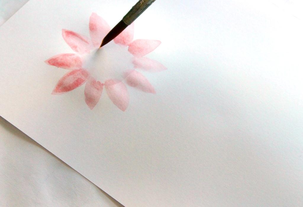 Schilder eerst de bloemblaadjes. Begin met een lichte kleur verf (dus sterk verdund met water). Je kunt de blaadjes altijd nog donkerder maken als je ze te licht vindt, maar donkere kleuren lichter maken lukt niet.