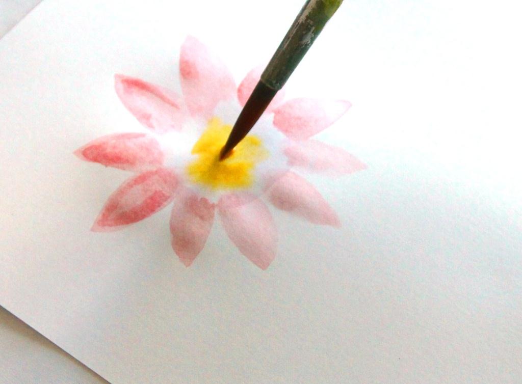 Schilder het hart van de bloem. Maak daarvoor een schoon penseel nat en strijk ermee over de plek waar het hart moet komen. Dip het penseel nu in de gele verf en schilder het hart. Door het papier van tevoren vochtig te maken, vloeit de gele waterverf mooi uit waardoor je geen scherpe randjes in het bloemhartje krijgt.