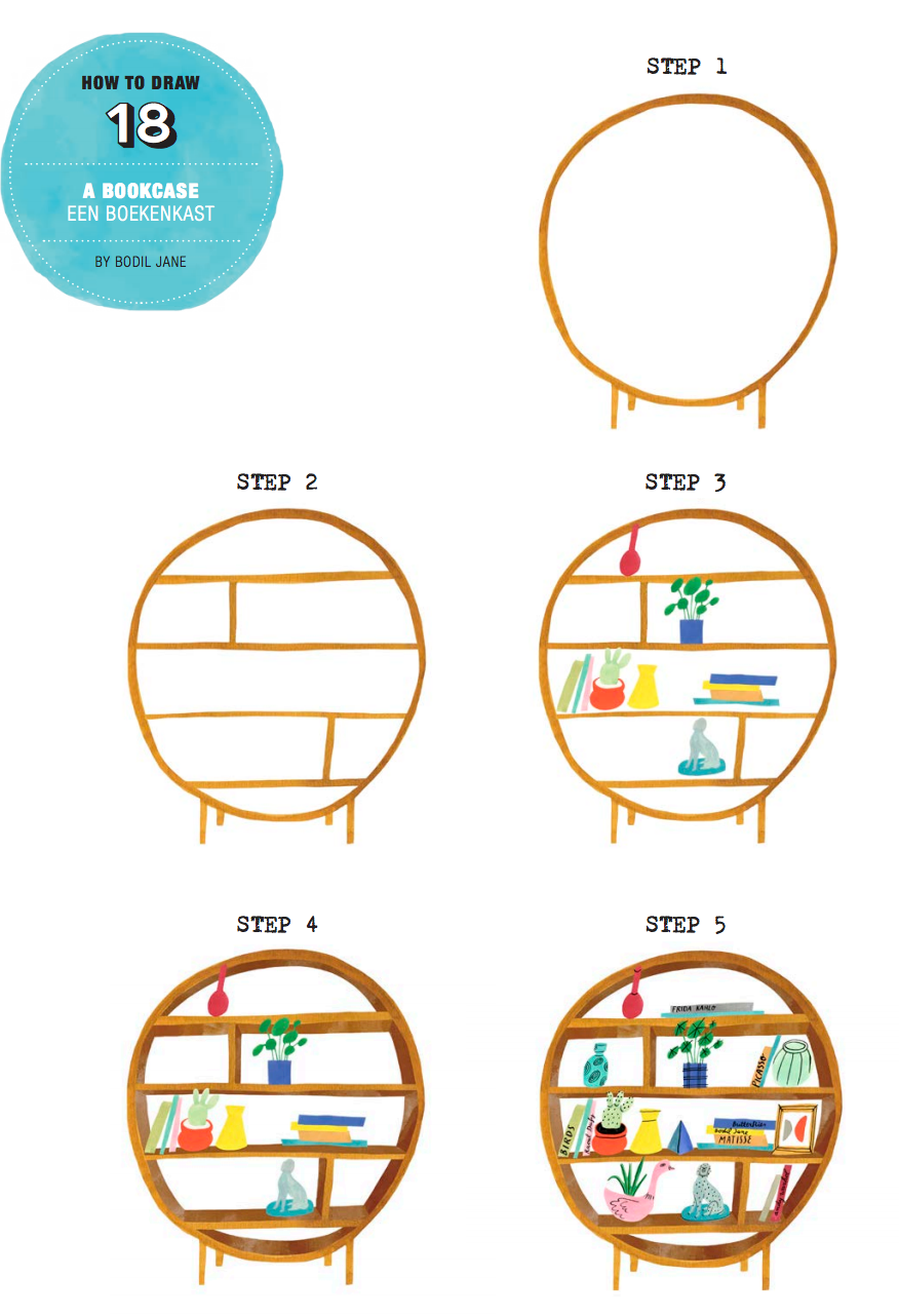 In Het grote stap-voor-stap Tekenboek vind je tekenlesjes van veel verschillende Flow-illustratoren. Zoals Bodil Jane, die laat zien hoe je zelf een boekenkast tekent.