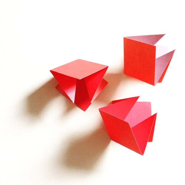Hieronder zie je dat de diagonale vouw tegenovergesteld is aan de andere vouwen in het vierkantje. De vierkantjes horen eruit te zien als op de afbeelding hieronder. Afhankelijk van hoe je de vierkantjes vouwt, heb je verschillende ‘vormpjes’. De rode vierkantjes op de foto noem je valley folds, het roze vierkantje noem je een diagonal mountain fold.