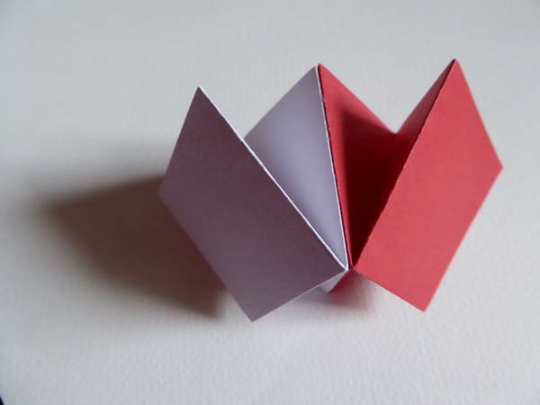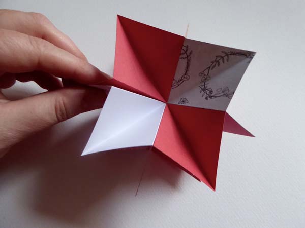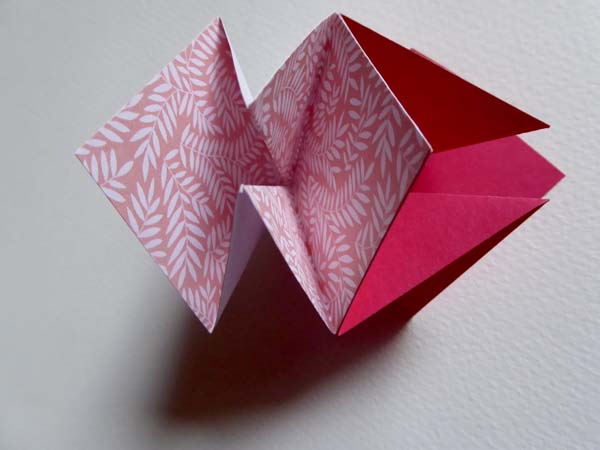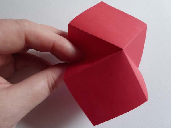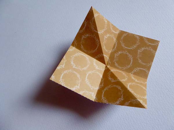 Pak de vierkantjes met de valley folds, plaats de wijsvingers van iedere hand op de diagonale lijn en trek de twee helften naar elkaar toe, zoals op onderstaande foto.