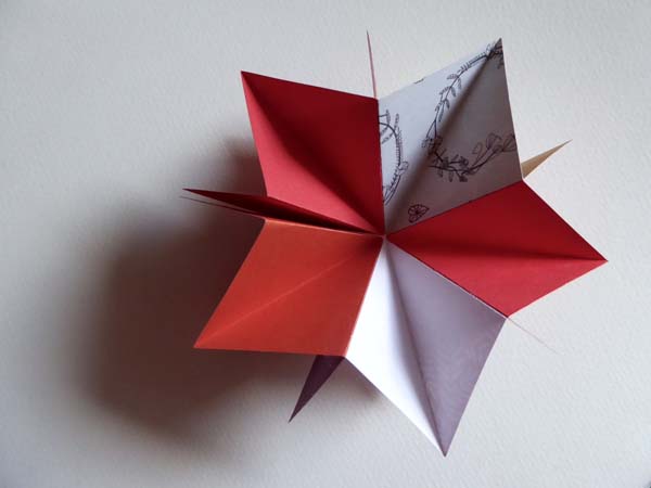 Je kunt er natuurlijk nog een vijfde aan plakken. Dat is extra starry. Een tip is om het laatste vierkantje niet aan het eerste te lijmen. Op die manier kun je de kerstster nog opvouwen als je hem niet meer wilt gebruiken. Meer dan vijf vierkantjes maakt de ster wat te zwaar.