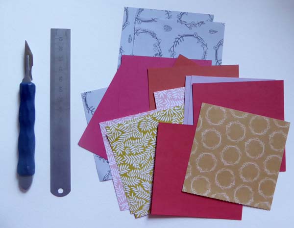 Kies je favoriete vellen papier en knip of snijd er vierkantjes uit. Probeer dit heel precies te doen. Per ster heb je vijf vierkantjes nodig.