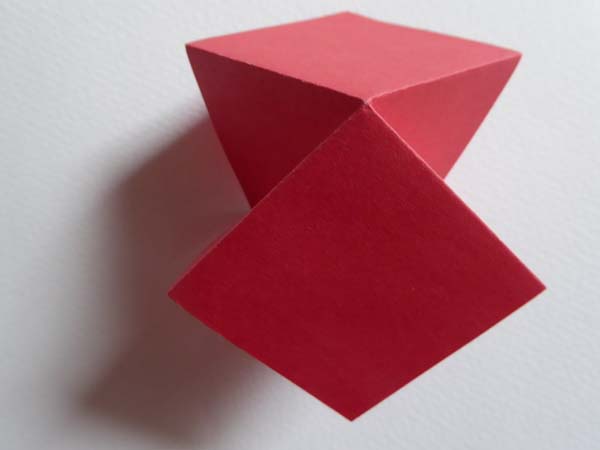 Plaats een ander gevouwen vierkantje voorzichtig op het gelijmde oppervlak. Zorg ervoor dat het middelste punt, de plek waar de vouwen samenkomen, in dezelfde richting wijst, zoals hieronder.