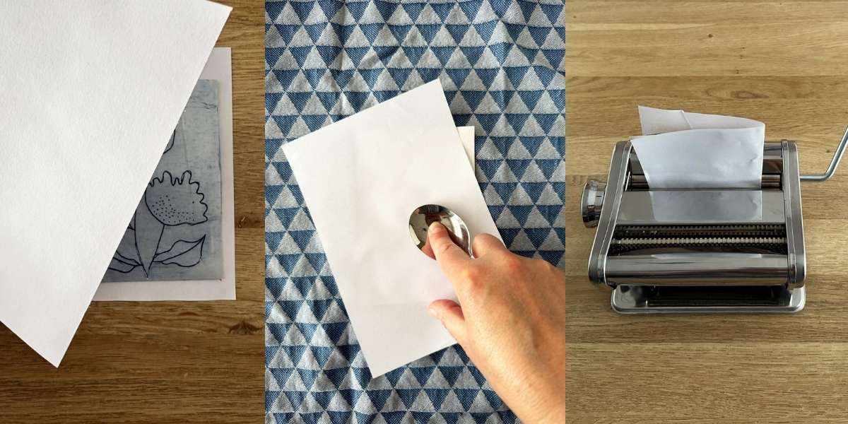 - Geen pastamachine? Je kunt ook met een lepel een mooie afdruk maken. Leg het kartonnetje met de inkt naar boven op een oude theedoek, zodat het niet kan verschuiven. Leg het vochtige aquarelpapier met de structuurkant naar