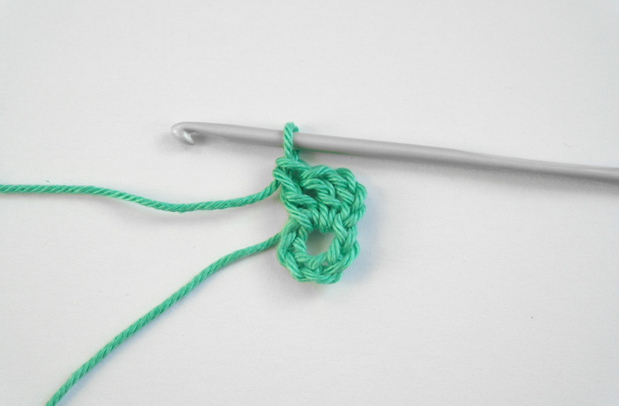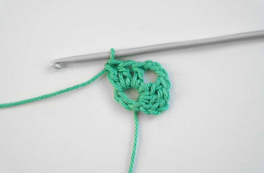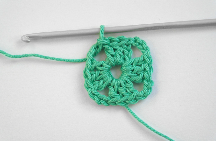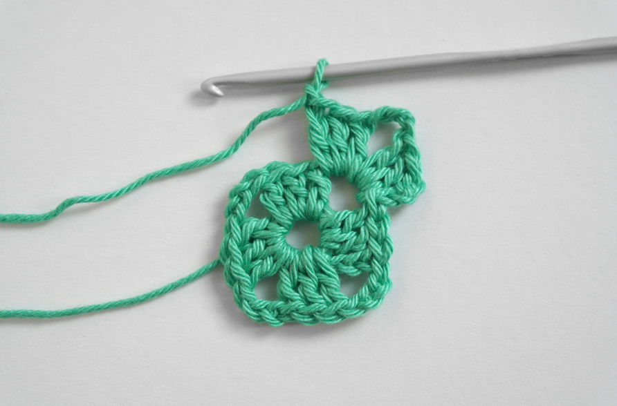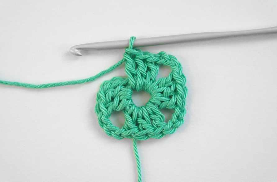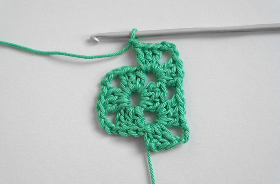 Stap 11: Herhaal stap 10 nog twee keer. Sluit de rij met een halve vaste in de derde losse van het eerste stokje.
