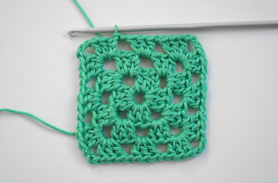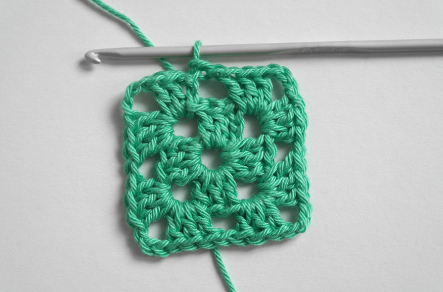 Stap 12: Maak de volgende rijen volgens hetzelfde principe (vanaf stap 8): met halve vasten ga je naar de eerstvolgende lossenboog, in de hoek-lossenbogen haak je steeds twee groepjes van drie stokjes – gescheiden door drie lossen, en op de rechte stukken steeds één groepje per lossenboog met één losse ertussen.