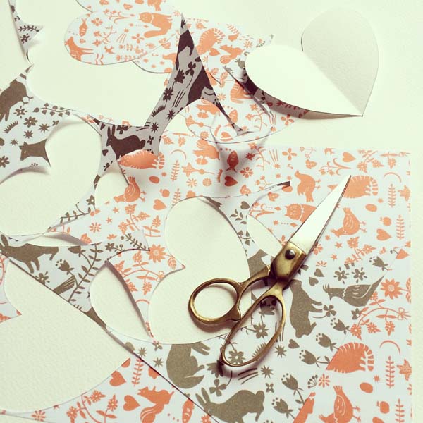 Lay heart template on paper, noticing the pattern repeat (be sure to pick the bits you want) and lightly draw around the edge with a pencil. Cut out lots of hearts….well at least five, and maybe not more than ten (but you can experiment with the effect of more later).