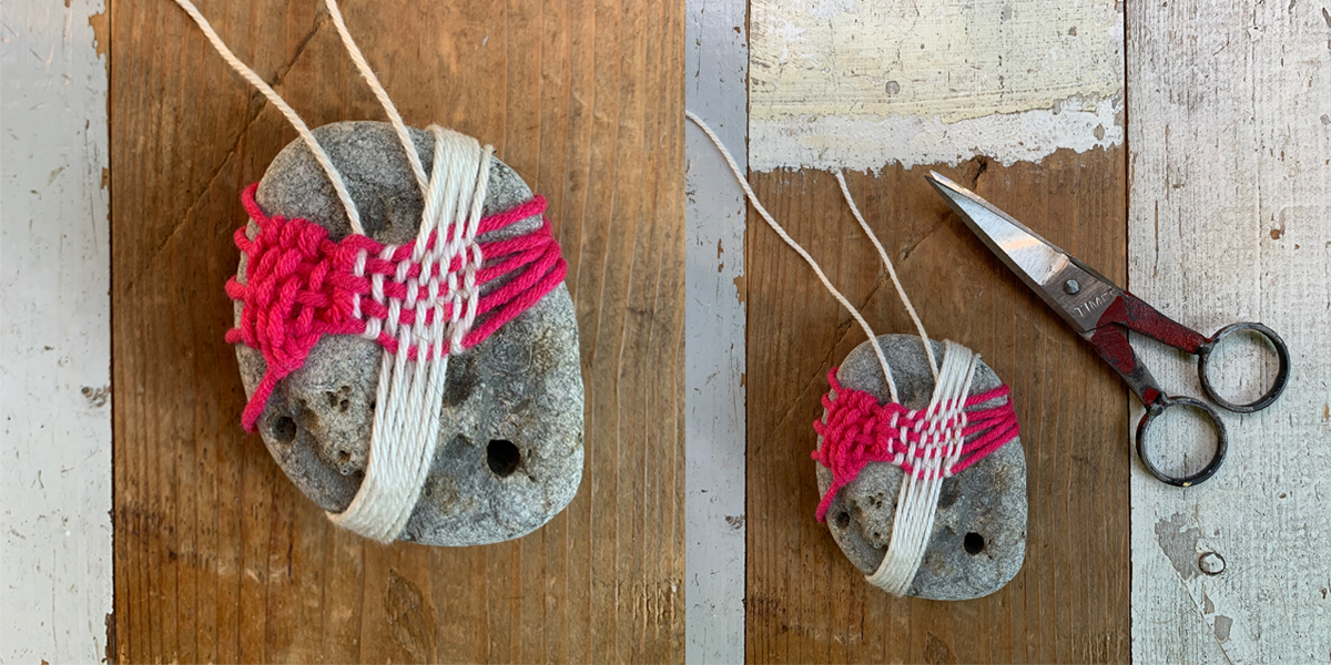 - Neem een andere kleur wol of katoen (hier is wit gebruikt). Weef hiermee een paar toeren onder het stukje dat je net hebt geweven. Breng de draad dan naar de andere kant van de steen en draai de steen om.