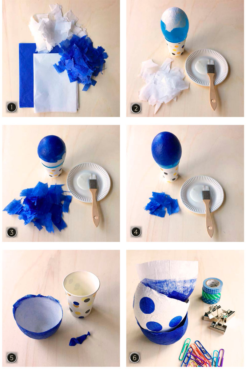 - Je kunt alle kanten op met de kleur en het ontwerp van de bakjes. Kies bijvoorbeeld voor papier met een patroontje voor de binnenkant (bij een effen buitenkant) of druk met een pons stippen uit tissuepapier en plak die op de buitenkant. Het dip dyeeffect van het bovenste bakje krijg je door boven op de ballon te beginnen met alleen laagjes blauw, dan een baan te maken van afwisselend blauw en wit vloeipapier en de onderste rand alleen met wit te beplakken.