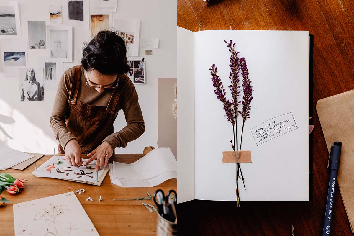 “Ik gebruik de geperste bloemen niet per se alleen voor een herbarium, maar ook om er kunst mee te maken. Van kaarten tot collages. Maar ik doe ook regelmatig een bloem tussen mijn dummy. Als ik die dan later tegenkom, brengt me dat terug naar de plek waar ik die bloem zag en plukte. Het is een speciaal soort souvenir eigenlijk.”