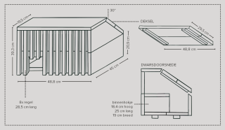- Voor het beweegbare dakdeel: zaag twee regels van 28,5 × 4,5 × 1,9 centimeter (H). Zaag een plank van 45 × 19,5 × 1,9 centimeter (K) in verstek schuin in de lengte op 30 graden, aan één zijde (I). Zaag één plank van 45 × 19,5 × 1,9 centimeter (K) op 11,5 centimeter in de breedte naar 11,5 centimeter en vervolgens aan de kopse kant in verstek op 30 graden (J).