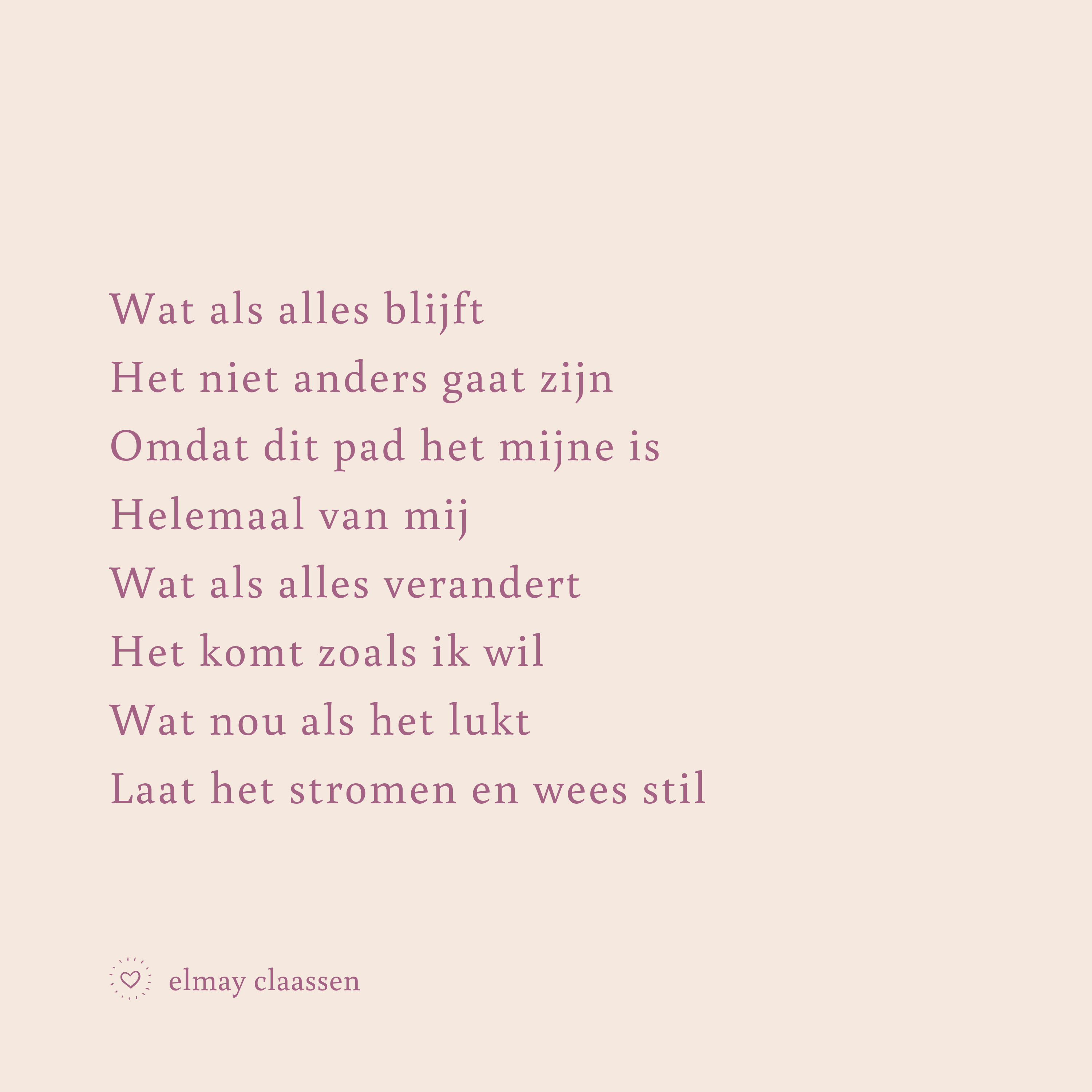 Huisdichter Elmay Claassen schrijft wekelijks een gedicht speciaal voor Flow. Over het leven, de liefde of klein geluk. ‘Gedichtjes om in te verdwalen,’ zoals ze het zelf noemt.