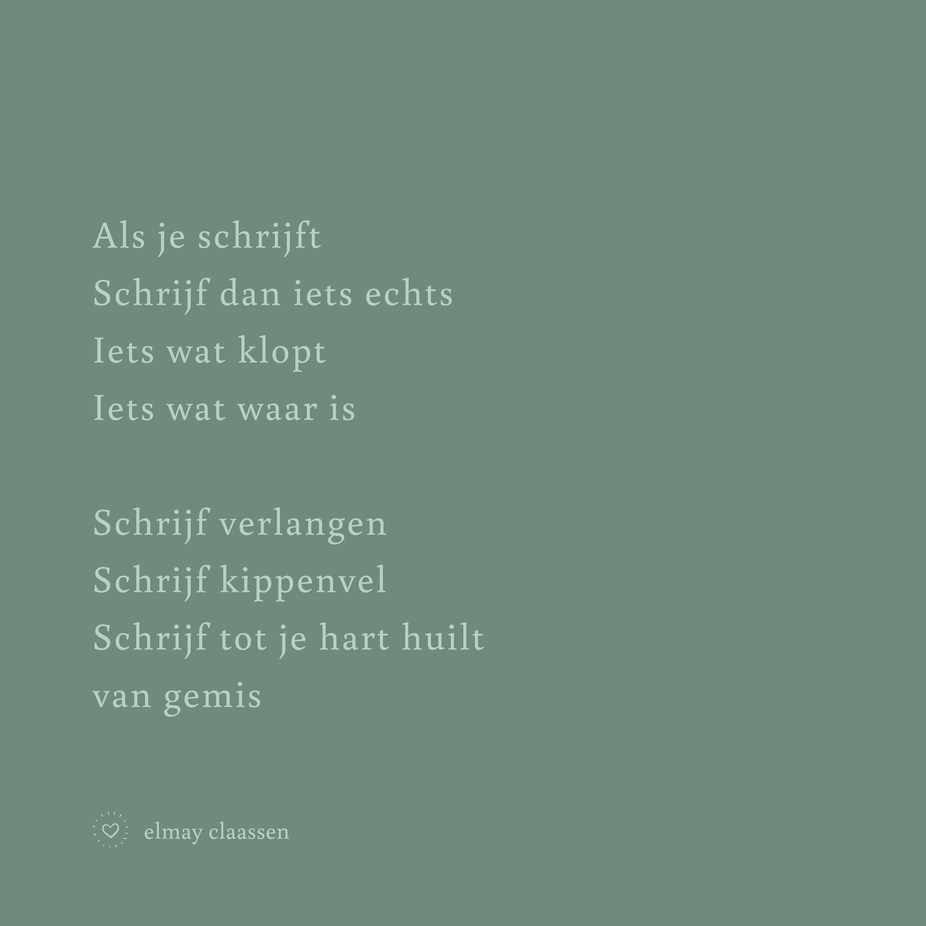 Huisdichter Elmay Claassen schrijft wekelijks speciaal voor Flow een gedicht. Over het leven, de liefde of klein geluk. “Gedichtjes om in te verdwalen,” zoals ze ze zelf noemt.