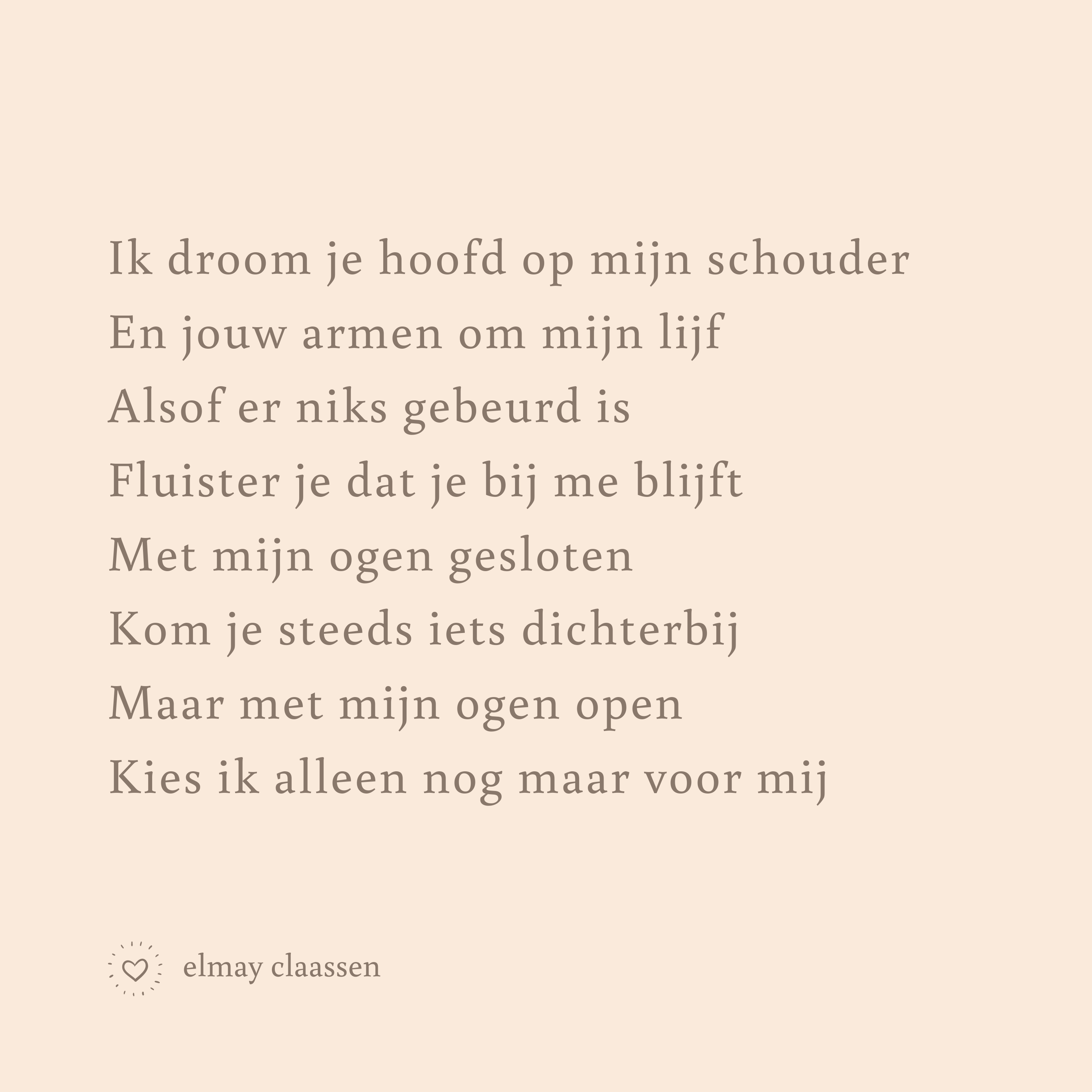 Soms gaat mijn fantasie ’s nachts met me aan de haal en bevind ik me opeens in de armen van een oude liefde. In mijn droom is dan alles perfect, ongeschonden en zoals het moet zijn. Helaas is de waarheid anders en is het in het daglicht vooral belangrijk om voor mijn eigen geluk te kiezen. Daar schreef ik deze week een gedichtje over.