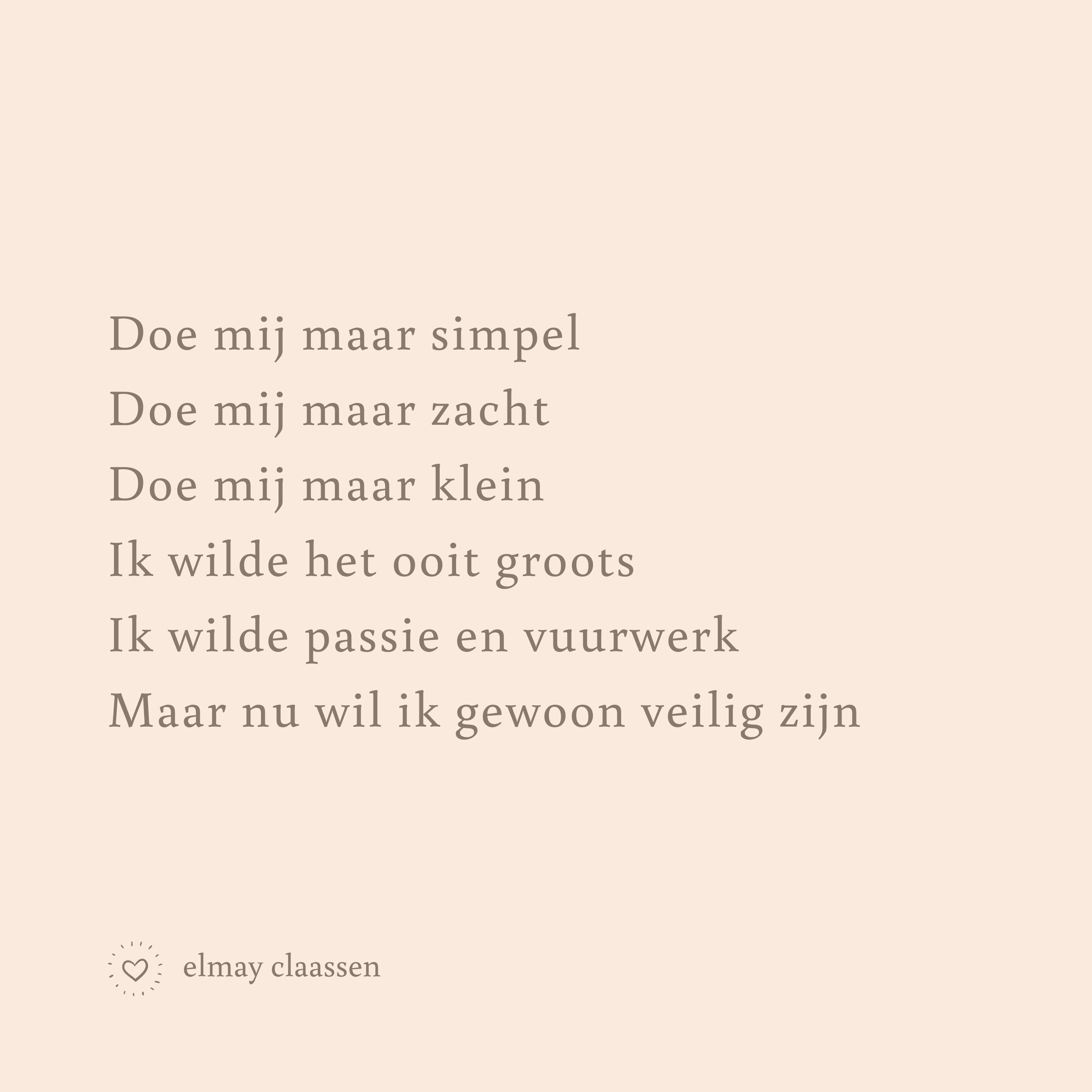 Als het om de liefde gaat, koos ik altijd voor passie en vuurwerk. De allesoverheersende verliefdheid, de adrenaline, de dramatiek, het liefdesverdriet. Alles groots. Dat was wat ik wilde en dus ook steeds aantrok. Maar de afgelopen weken is daarin iets aan het verschuiven. Ik vraag me steeds vaker af hoe het zou zijn als de liefde gewoon klein is. Daar schreef ik deze week een gedichtje over.