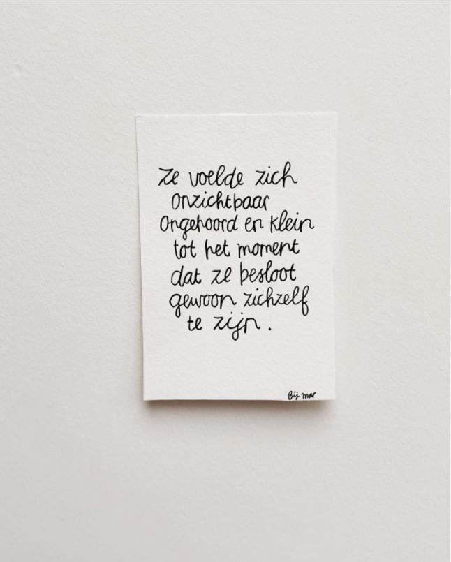 De gedichtjes van Elmay zijn lief en herkenbaar. Ze maakte onlangs samen met @klijnekrabbels een eigen kaartencollectie met een combinatie van poëzie en illustraties. Op haar Instagram deelt ze, volgens ons, mooie woorden die je kunt sturen naar iemand die je lief is.