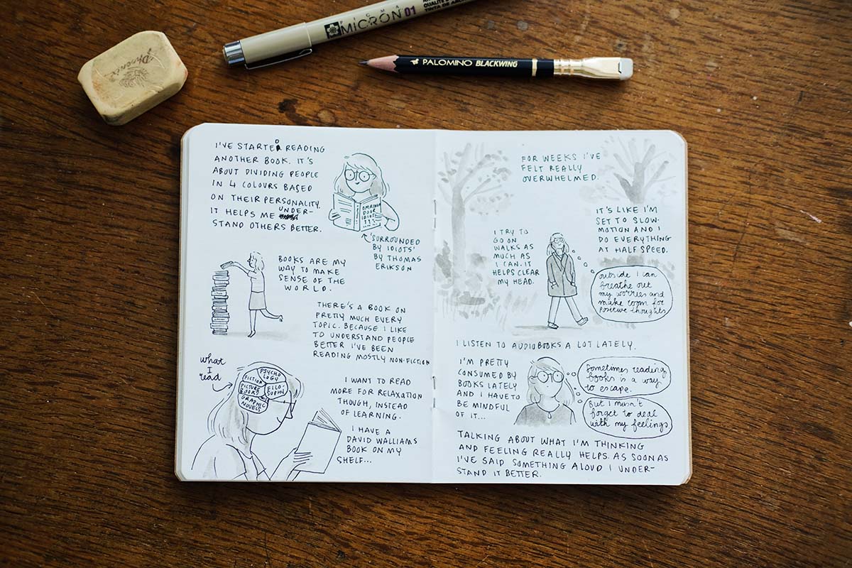 Illustrator Marloes de Vries werkt veel in een journal, het bevat voor haar zelfs een ’therapie’-element. Ze krabbelt persoonlijke dingen in haar notitieboekjes om gedachten op een rijtje te krijgen.