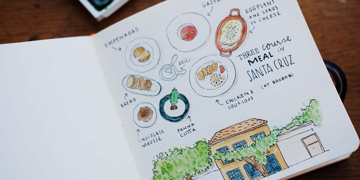 Ik heb goedkope schetsboeken van Talens die ik gebruik om landschapsschetsen te maken voor mijn schilderijen, of gewoon een beetje te krabbelen. En dan Moleskine-boekjes met dun blanco papier, die ik voornamelijk gebruik voor illustratie-opdrachten voor klanten. Daarin schrijf ik met potlood, maar maak ik ook schetsjes. Ik maak ook travel journals van mijn vakanties, waarin ik vanalles schrijf over wat ik zie en meemaak. Die hebben als doel om te delen met anderen, dus ik ga er niet álles in zetten. Hoewel ik wel over mijn voorliefde voor gigantische onderbroeken die tot je oksel komen heb geschreven. No shame! Hahaha!”