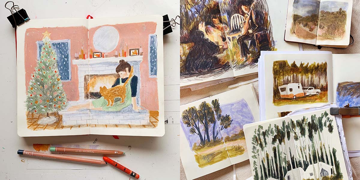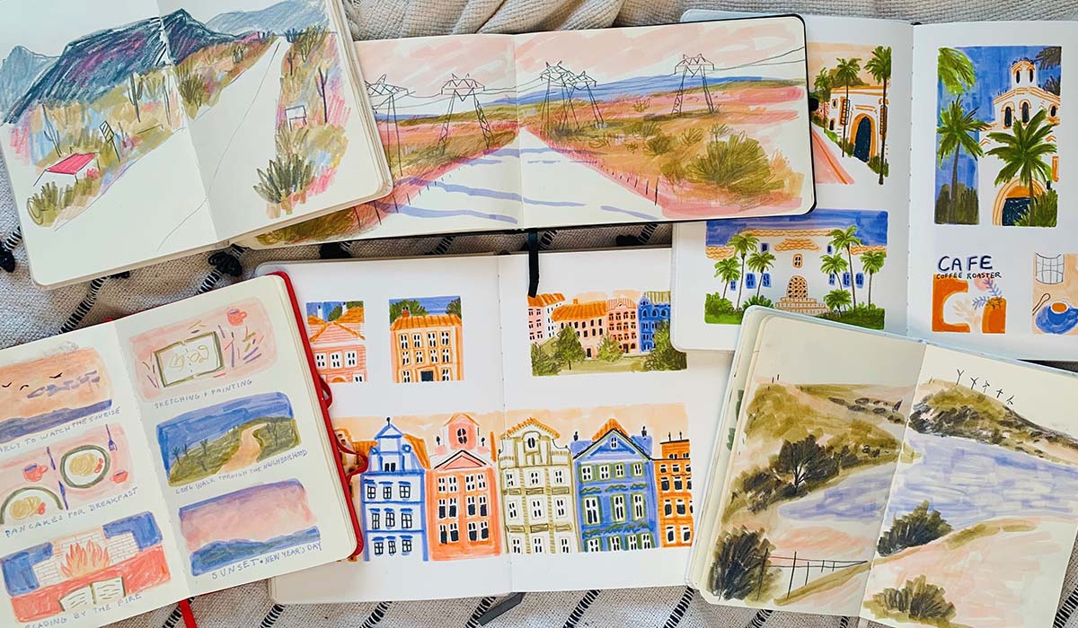 “Het heeft iets speciaals om mijn tekeningen en herinneringen op de bladzijden van een boek te hebben. Het is leuk om mijn reisverslagen na afloop van een reis door te bladeren en ze met andere mensen te delen. Ik grijp vaak terug naar de beelden in mijn schetsboeken om ideeën op te doen die later in schilderijen en illustraties worden omgezet. Reizen zijn zo inspirerend.
