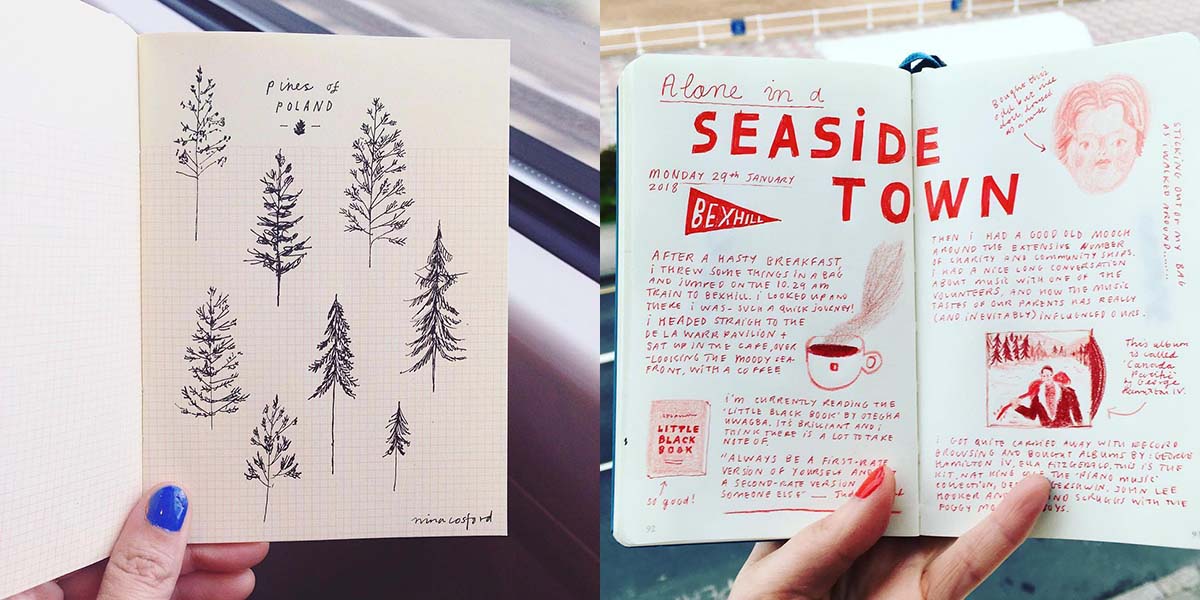 “Denk er niet te veel over na. Eerlijk gezegd, pak gewoon een pen en begin met schrijven. Beschrijf waar je zit, wat je kunt zien en waar je aan denkt. Je zult verbaasd zijn hoe natuurlijk en gemakkelijk het wordt naarmate je het vaker oefent. Als je het visueel aantrekkelijker wilt maken, probeer dan de pennen die je gebruikt af te wisselen en experimenteer met handschriftstijlen en paginatitels. Ik schrijf ook graag citaten, gedichten of songteksten op, die kunnen helpen om de stukken persoonlijke tekst te breken. Tekeningen en krabbels zijn ook leuk tussen de pagina’s. Onthoud: het is een persoonlijke plek voor jou, niet voor iemand anders. Dus verwijder elk oordeel.”
