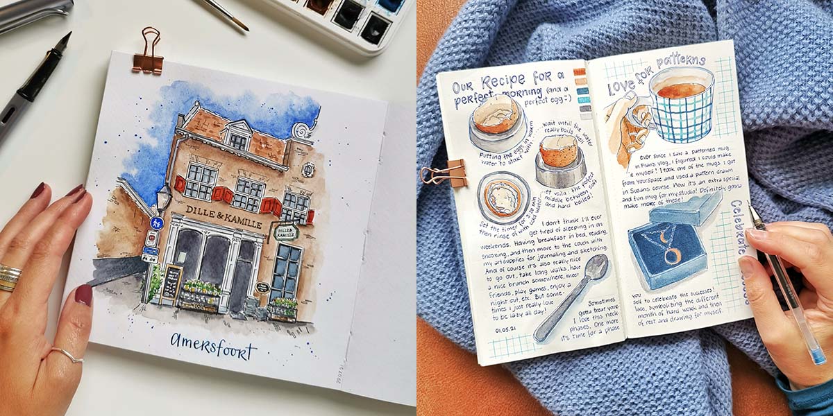 Daarnaast heb ik mijn zogenaamde ‘sketch journals’. Die zijn eigenlijk een combinatie van een dagboek en een schetsboek. Dat is voor mij echt de plek waarin ik herinneringen vastleg. De ene keer omdat ik lekker zit te tekenen in een koffietentje, de andere keer omdat ik op reis ben. Die zijn het allerleukste om regelmatig door te bladeren vind ik zelf, net als vroeger door je fotoboeken. Maar nu met beelden die ik zelf getekend hebt.