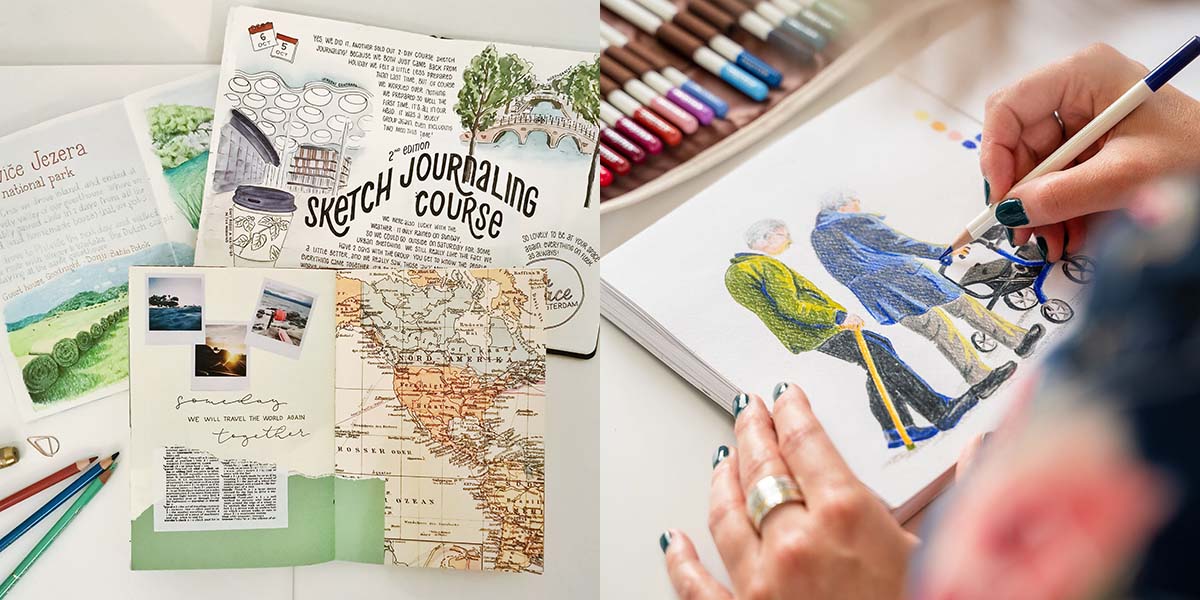 Als je trouwens graag wat meer handvatten wilt hebben om te beginnen: ik heb samen met m’n collega Anne van Gouden Lijntjes twee online cursussen Sketch Journaling gemaakt. Ik word nog altijd zo blij als ik resultaten van deelnemers zie, hoe snel mensen groeien doordat ze met een paar tips beter weten hoe ze zo’n pagina kunnen aanpakken. Dat is trouwens ook een tip die ik heel vaak geef: ga het doen! Online inspiratie zoeken op Pinterest is leuk, maar van zelf doen leer je het allermeeste.”