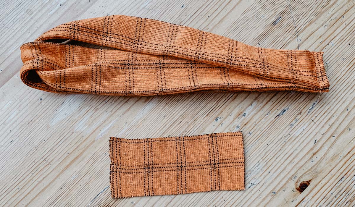 • Twee banen stof van 8 centimeter x ‘je hoofdomvang’ plus 3 centimeter extra voor de lengte. Knip de stof in de breedte voor extra rek of in de lengte voor iets minder rek.